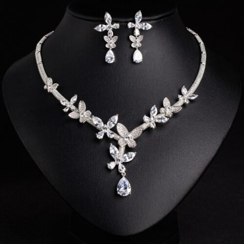 Elegant flower zircon necklace with matching earrings — a luxury European & American style clavicle chain jewelry set perfect for banquets, weddings, parties, dates, and evening look enhancements.