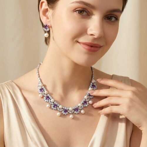 Elegant European & American style pearl and AAA zircon necklace paired with matching earrings — a luxury jewelry set designed for weddings, banquets, bridal looks, and special occasions with a refined high‑end finish.