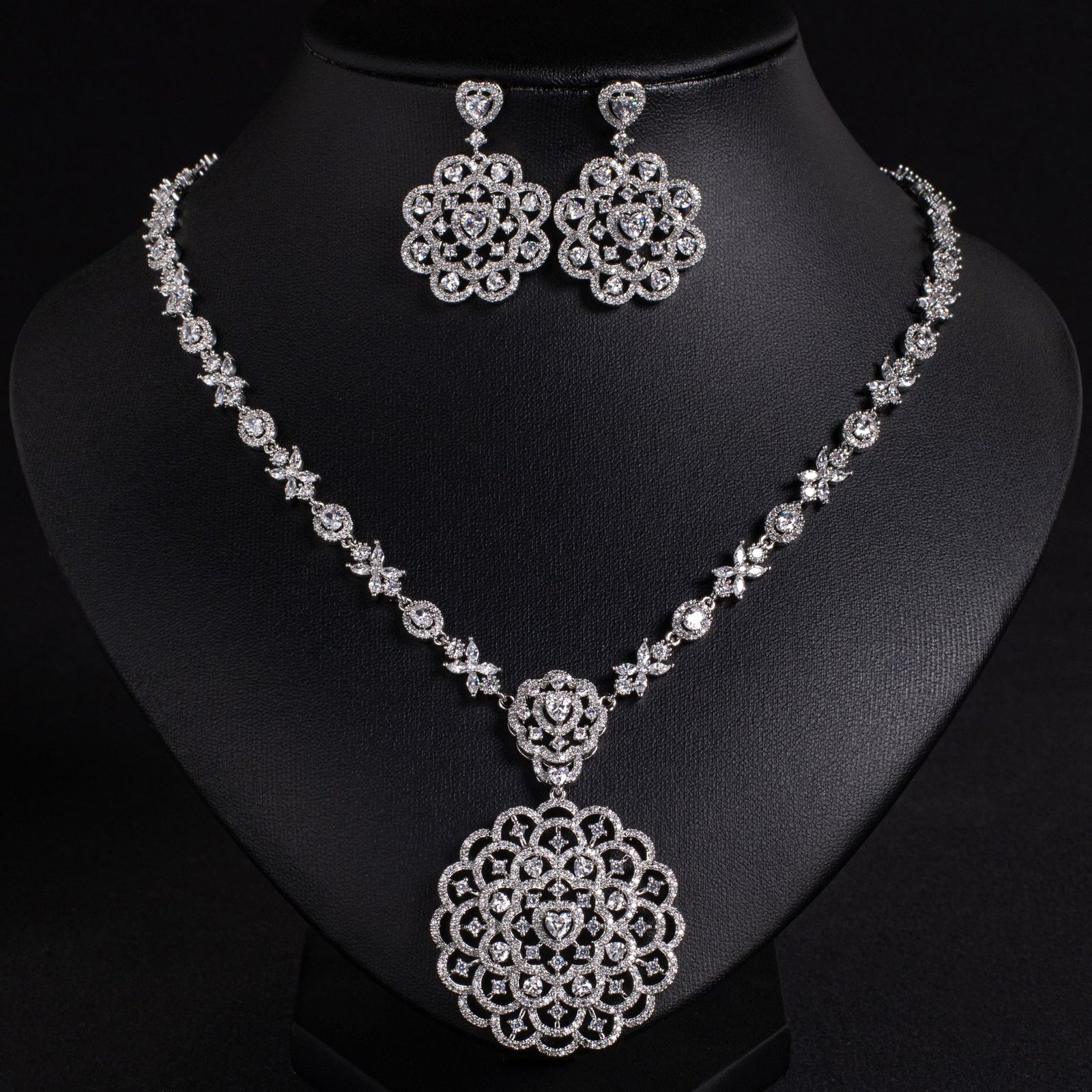 European Luxury Silver Garland Necklace & Hollow Pear-Shaped Flower Pendant Earrings Set