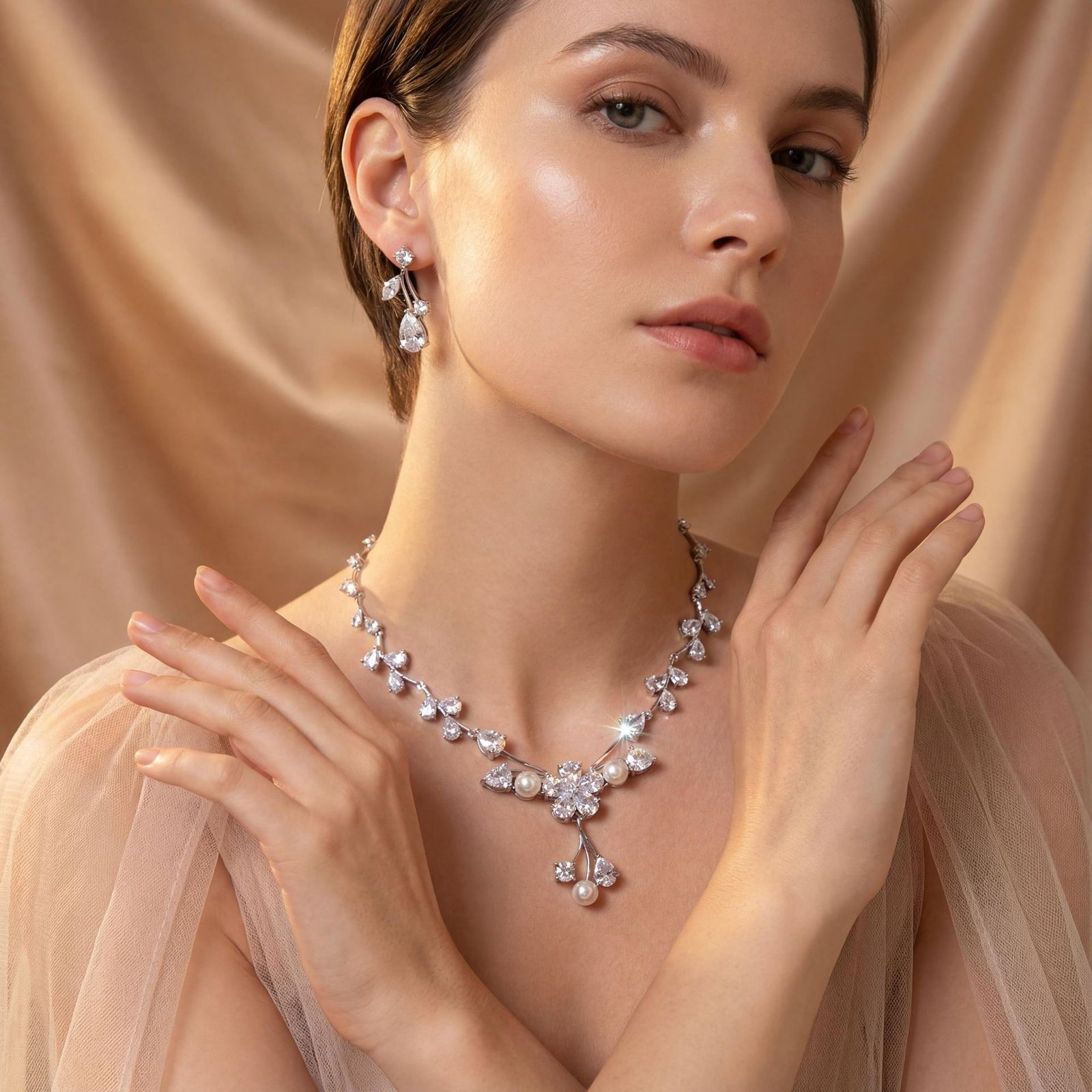 This set features an exquisite flower motif adorned with brilliant zircon stones that catch the light beautifully from every angle. The necklace sits delicately at the collarbone, enhancing your neckline with refined brilliance, while the coordinating earrings complete your look with polished sophistication. Whether you’re celebrating a wedding, attending a banquet, hitting a party, going on a date, or elevating a chic casual outfit, this jewelry set brings accessible luxury and standout shine to any occasion.