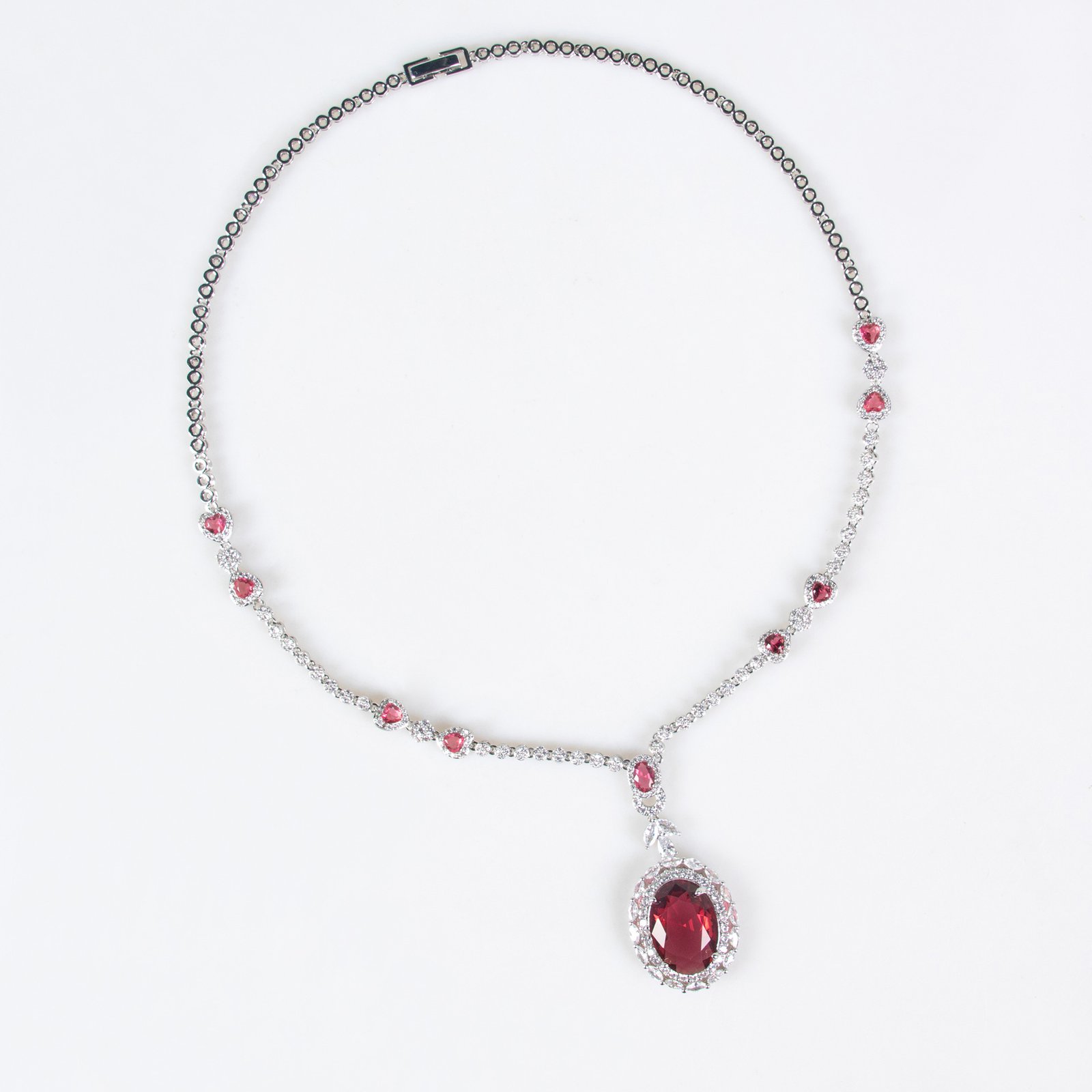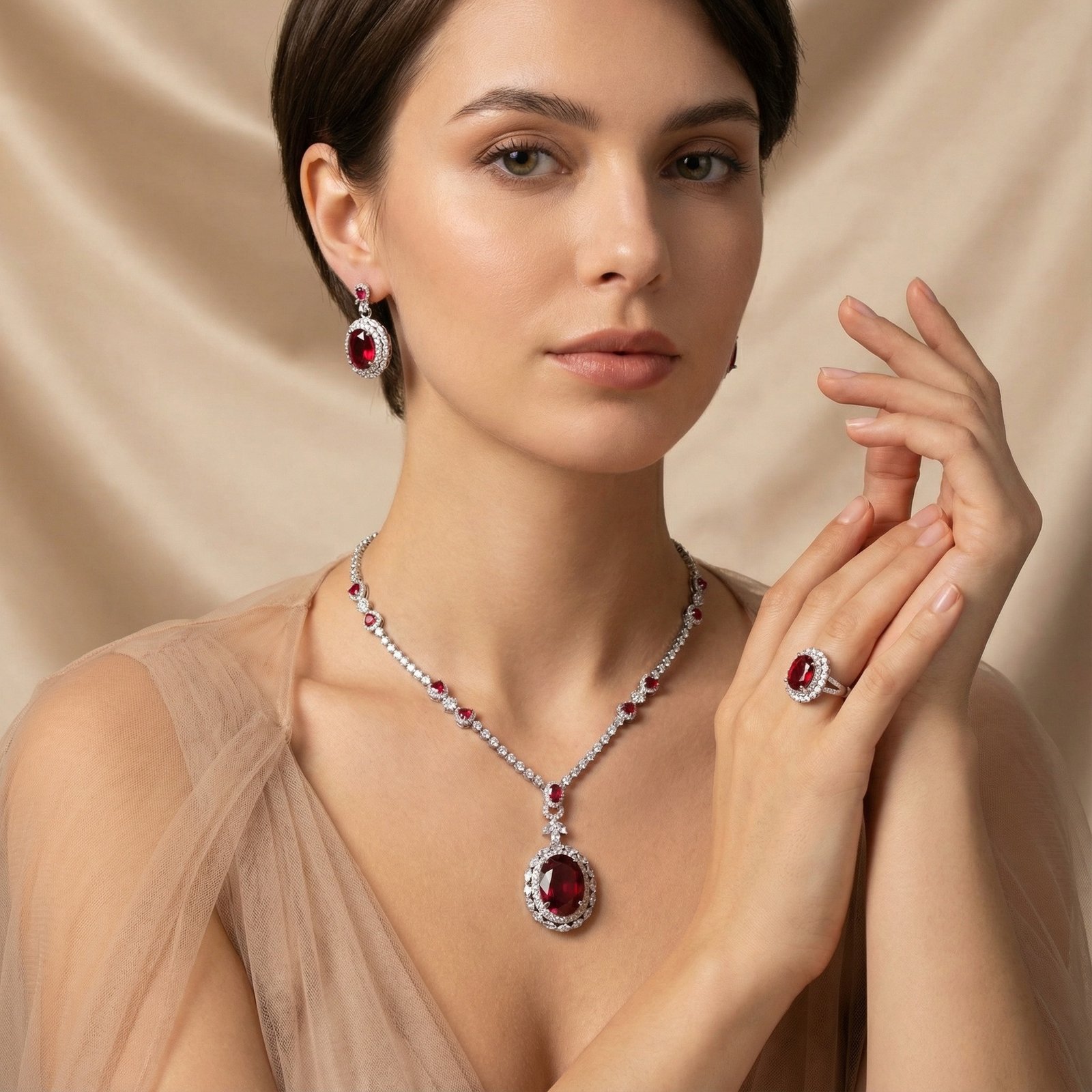 Inspired by timeless bridal and fashion jewelry designs, this set features rich ruby-colored stones paired with dazzling cubic zirconia accents that mimic a full diamond-like brilliance. The striking contrast of deep red and shimmering crystals makes it perfect for weddings, formal events, banquet evenings, and special celebrations — or whenever you want to make a statement. Whether paired with a bridal gown, elegant evening wear, or chic party outfit, this set delivers luxe visual impact without the high price tag.