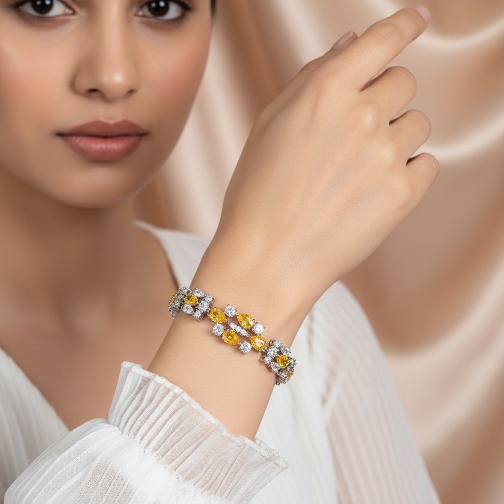 An elegant luxury bracelet for women, featuring shimmering zircon stones in a colorful water‑drop and geometric design — perfect for parties, everyday chic looks, and special occasions.